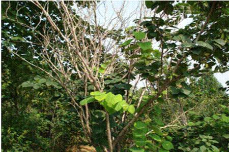 一般叶片多从病枝顶端开始出现发黄、脱落,一般先从个别的枝条发病,然后逐渐发展至整个植株。