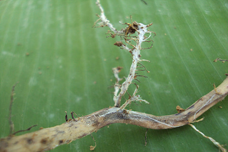 成熟的植株会在地表茎上产生大量的黑色凹陷病斑,并且裂开,病斑上的小黑点排列呈轮纹状,边缘有白色菌丝。