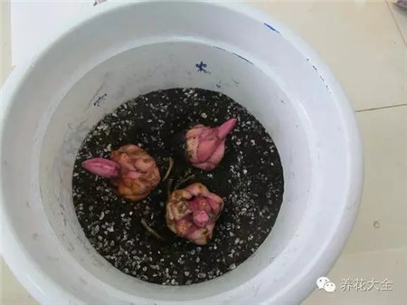 6.土填完后,盖住种球,让芽露出土面,浇水一次浇透,第二天再浇透一次,然后放先放阴凉处养护一周。