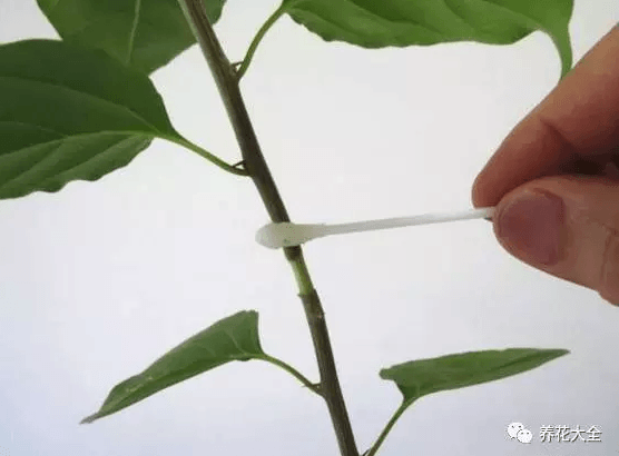 2、用棉签蘸取一点生根粉,涂抹在环剥出来的伤口上。