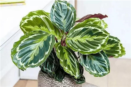 天使竹芋也是一款叶片宽大的竹芋,叶片的边缘有一圈白色的圆圈,叶子中心部位是较深的绿色,养护得当的话,主叶脉会呈现红色。