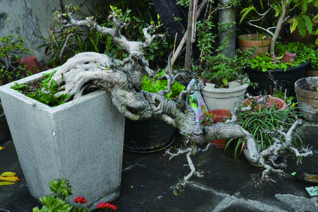 云头雨脚在盆景的构图上可以简单的理解为倒三式的造型,也就是上大下小。这个造型有时候会附石一同实现。