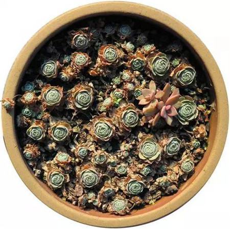 又过了一个多月,子持彻底爆发了,长出的新芽又长了新芽,一层一层在压在盘上,有的垂吊在边缘。