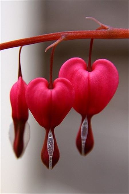 学名荷包牡丹Dicentra spectabilis,原产于中国北部,花如荷包、叶似牡丹、多为桃红色与白色的复色花,花形玲珑叶丛错落。因其形似心脏,英文也称之为Bleeding heart。