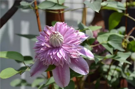 漂亮的重瓣铁线莲,粉色花瓣中部为还有一条深粉色的长带,带着独特的美丽,而且花期长,整个夏天都可以看花,非常适合小花园或盆栽。