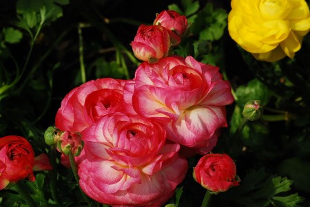 长时间的光照可以促使花期提早到来、促进分化形成球根;光照时间段的话,则会使花期延迟,但是可以促使侧芽增加、花朵的数量也相应增加。因此通过调节光照的时间的长短就可以控制花毛茛的品相、调整花期到来的时间早晚。