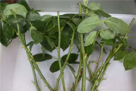 ①准备扦插的月季枝条,至少两个节点,多余的叶子剪掉,以免浪费营养。