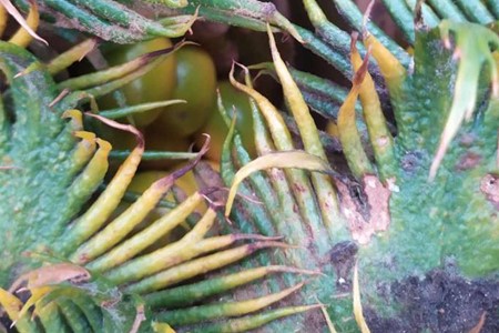 2、扦插繁殖:扦日夏养花网插繁殖可选在每年的5月份左右,这个方法不常用。先将茎干部分切成10-15厘米的厚片,然后放在阴凉处晾干,厚片晾干后埋到沙土中,一段时间后,铁树厚片就能萌发新芽。之后就配制好疏松的腐殖土,将发芽的厚片http://www.rixia.cc埋进去。