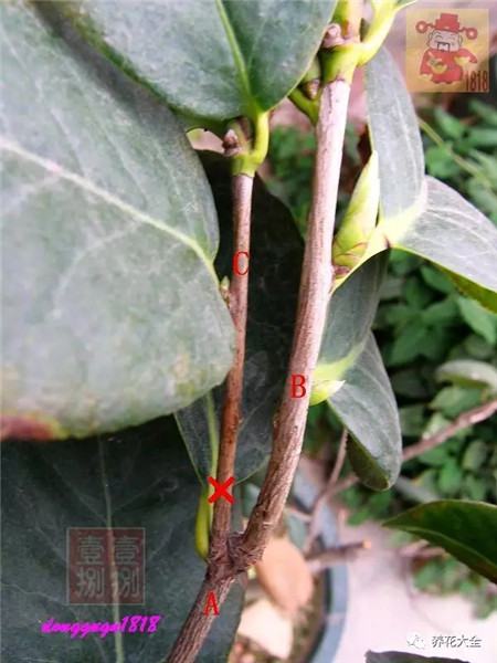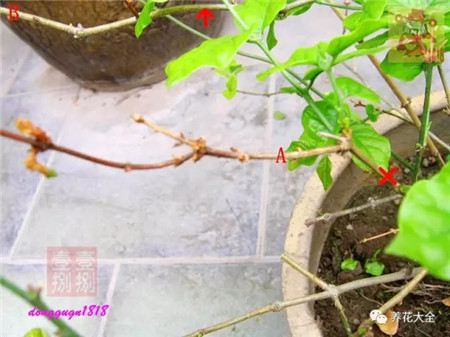 ▼A枝及侧枝B,为4-5年生的枝条,应循“去弱留强、去老留新”的原则进行修剪,留C(新)枝,并将C枝相应地进行截枝回缩,即红色双箭头标出的地方,让其长侧枝。双箭头所示的横线位置与日夏养花网红叉部分枝条为修剪提示。